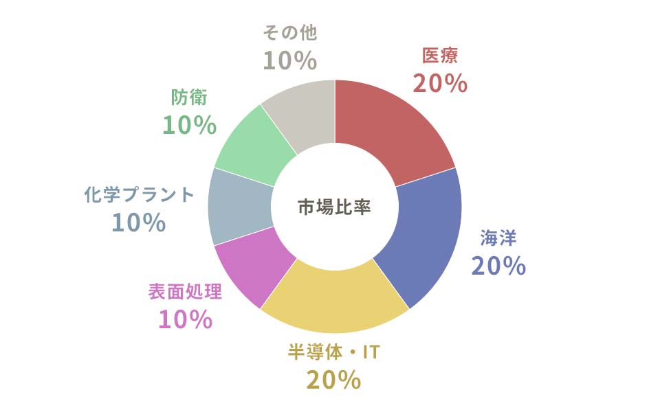 海洋関連分野としてのチタンは、海水に対して腐食しにくく耐海水性、軽量、高比強度の点で活躍します。