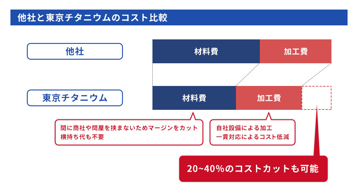 チタン材料・チタン加工販売において、仲介業者を通さない事によるコストダウンが強みのひとつです。材料問屋もやっており、大量に仕入れているので材料コストを抑えて提供できます。