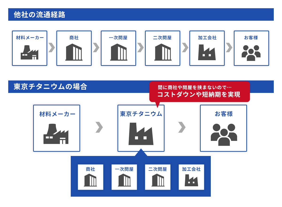 東京チタニウムは、国内外問わず複数の展伸材メーカー様とお取引がございます。チタン材料の調達先が数社あることは、経済情勢の動きや市況の変動等に左右されずに、材料の安定供給につながっております。国内外展伸材メーカー様から、ほぼ直接材料を仕入れる体制が整っていますので、中間卸業者削減により、コストメリットのある提案ができるのが強みです。